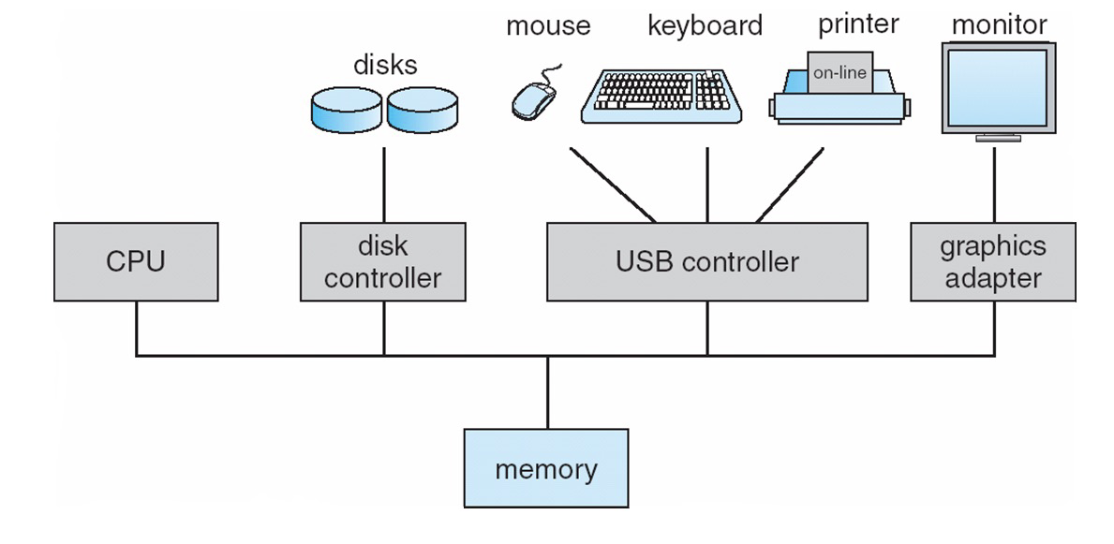 - CPU, Main Memory, I/O Device Controllers가 공통 Bus를 통해 연결되어 있음